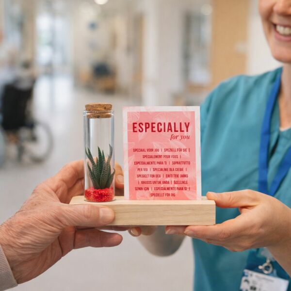 In deze variant staat één glazen flesje met levende mini-succulent stevig op een houten standaard, voorzien van een sleuf voor een los A7-kaartje. Zowel het kaartje als het houten blokje kunnen gepersonaliseerd worden met een logo, boodschap of ontwerp naar wens. Bij dit artikel is het A7-kaartje zoals op de foto standaard inbegrepen. Wil je in plaats daarvan een eigen gepersonaliseerd kaartje in full color toevoegen? Kies dan de personalisatie-optie, je betaalt alleen de opstartkosten voor het bedrukken. Het flesje bevat een laagje zand of gekleurd grind en vormt samen met het kaartje een opvallende en blijvende attentie.