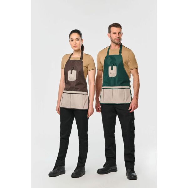 100% polyester. Gemaakt van 100% gerecycleerd polyester. Gecoate en waterdichte 4000 mm Oxford-stof. 7 open zakken op 2 niveaus met contrasterende bies. 1 borstzak met klittenbandsluiting. Lint en gesp van gerecycleerd plastic aan de hals en de taille om de maat van de schort aan te passen. Totale hoogte van de schort = 60 cm Breedte van de onderkant van de schort = 46 cm.