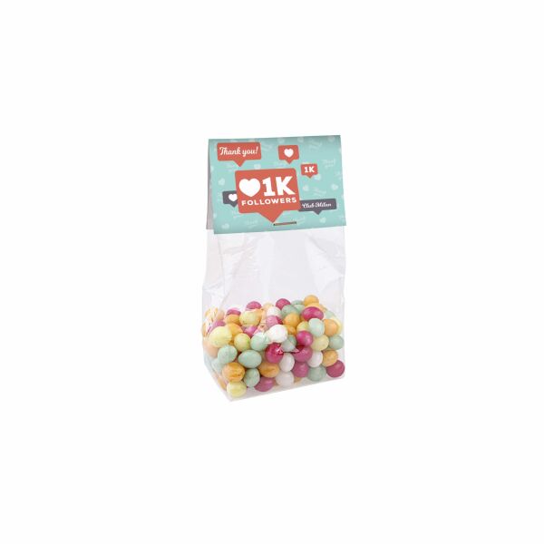 Transparant blokzakje met full colour bedrukt kopkaartje, gevuld met ca. 100 gram Dropstaafjes mix